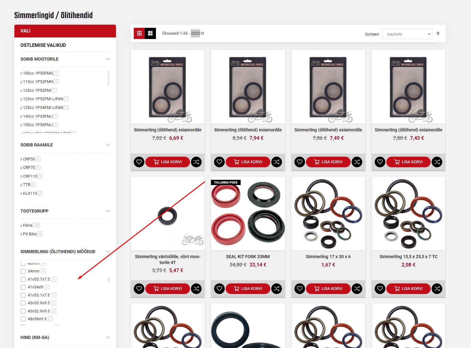 Mõõdu saad valida filtrite menüüst. Meil on tootevalikus üle 2000 simmerlingi nii ATVdele, krossiratastele, mootorratastele kui ka veetehnikale.